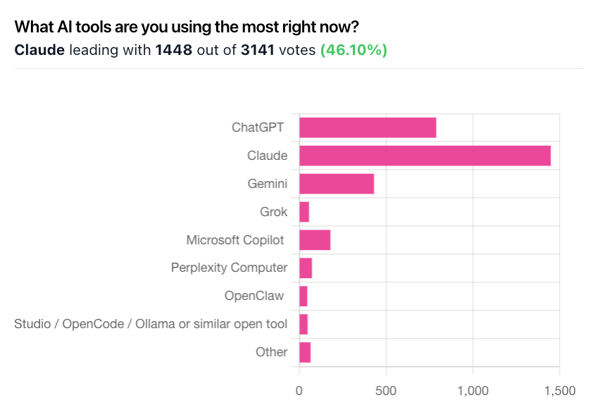 First up, the final tally. At time of writing this: 3,143 votes. Claude 1,449 (46%), ChatGPT 790 (25%), Gemini 431 (14%), Microsoft Copilot 180, Perplexity Comet 74, Grok 57. A self-selected bias from an AI newsletter audience, yes; but a loud, specific, paying-attention one. |