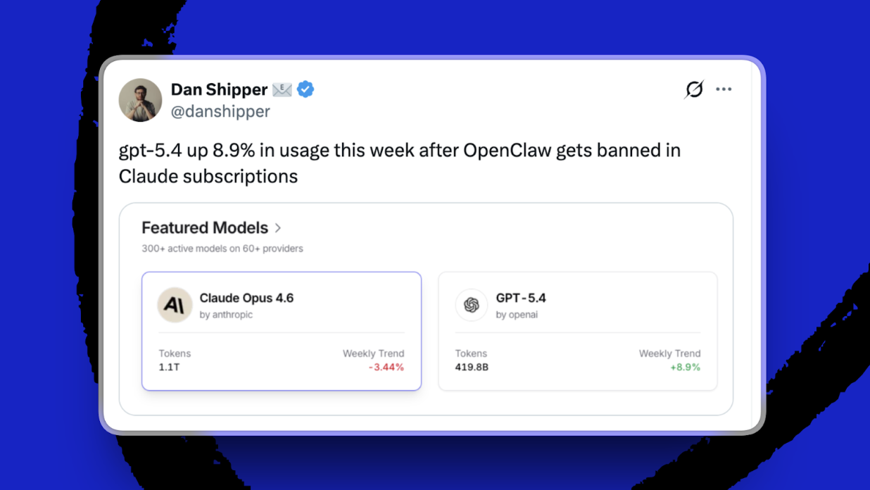 The implications: Anthropic’s ban provides an opening for OpenAI to siphon away users. The strategy appears to be working: Opus 4.6 token usage is significantly down week over week; GPT-5.4’s has surged.