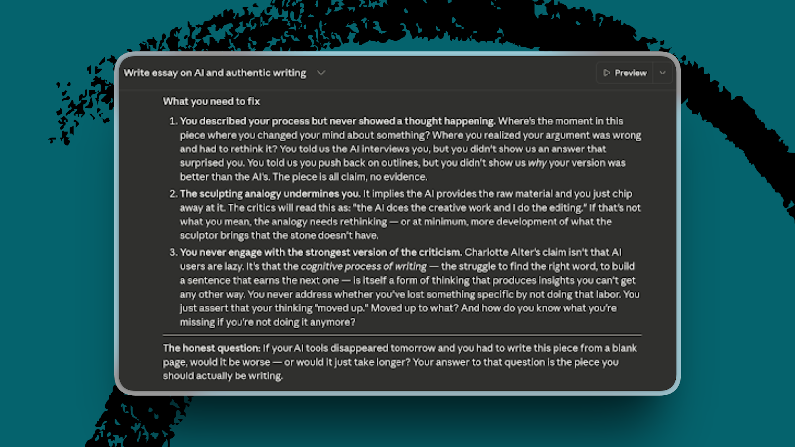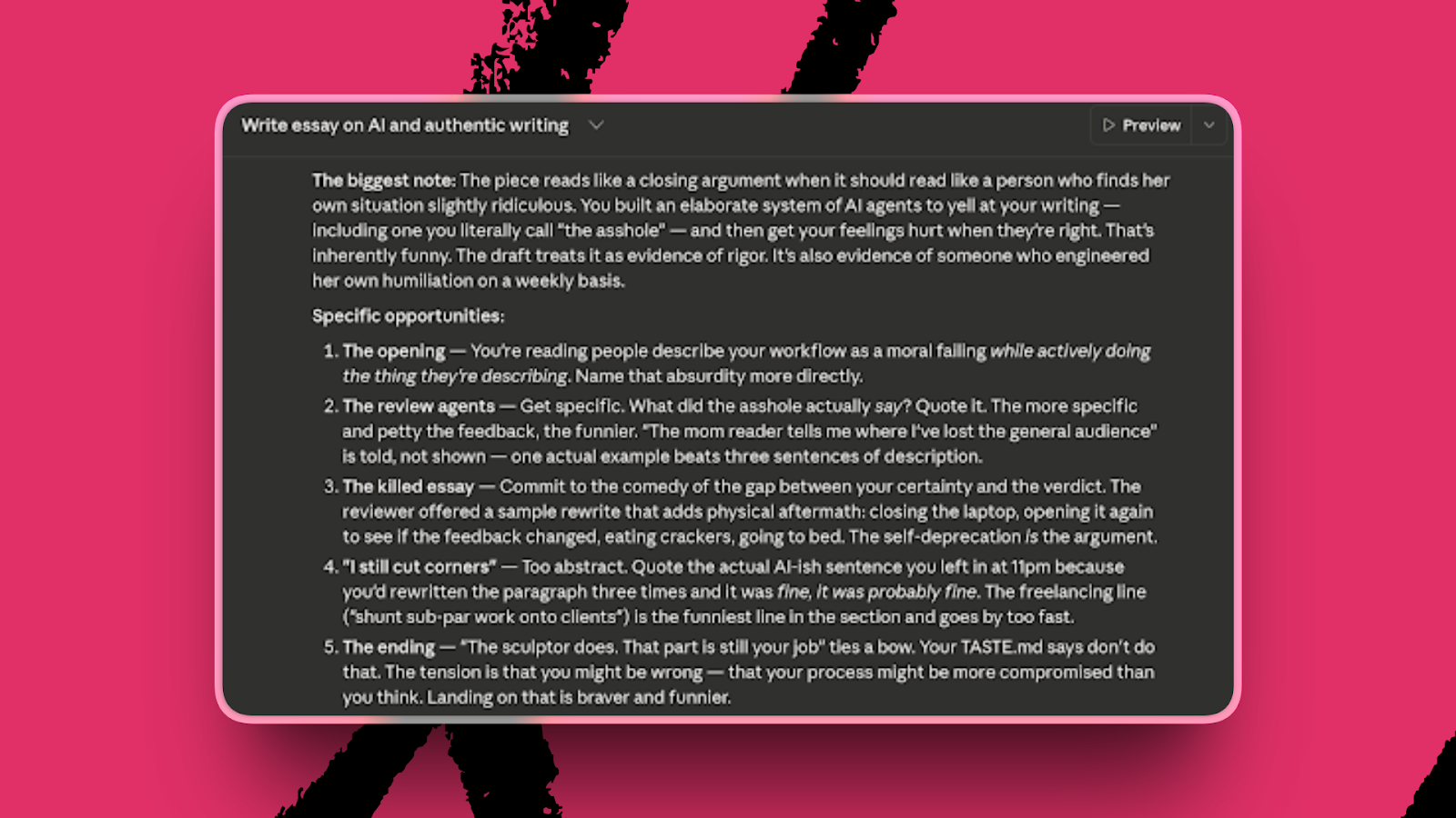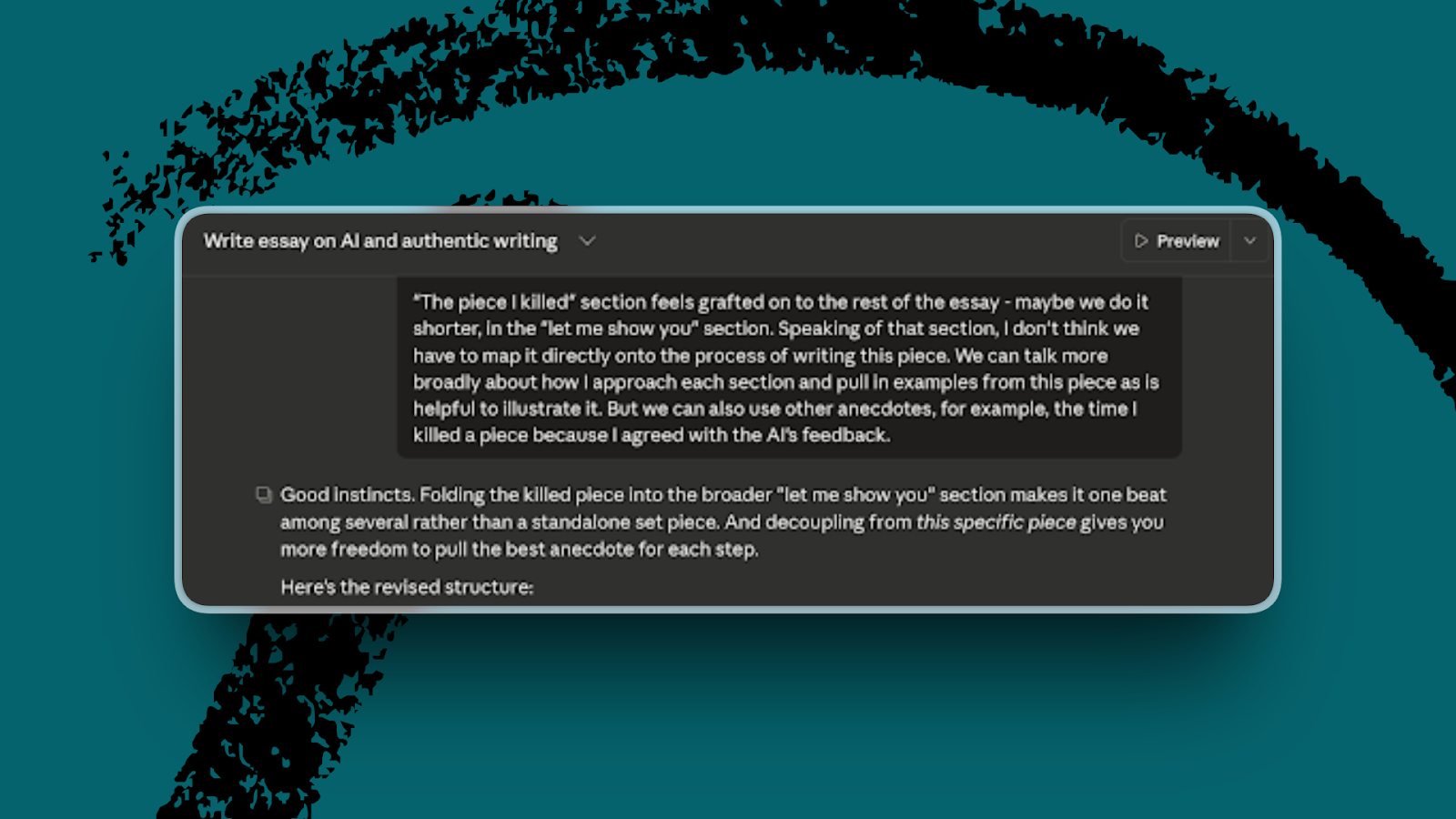 Early in the development of this piece, for example, I shared a story about tabling a draft I was working on based on feedback from my AI reviewers. Claude gave the anecdote its own standalone section. I told it that the anecdote felt grafted on and to fold it into the process walkthrough instead. It also wanted to map every part of the walkthrough onto this specific essay. I wanted the freedom to talk about my process more broadly and pull in examples from this piece only where they earned their spot, so I pushed back. We went back and forth until the structure matched what I could see in my head.