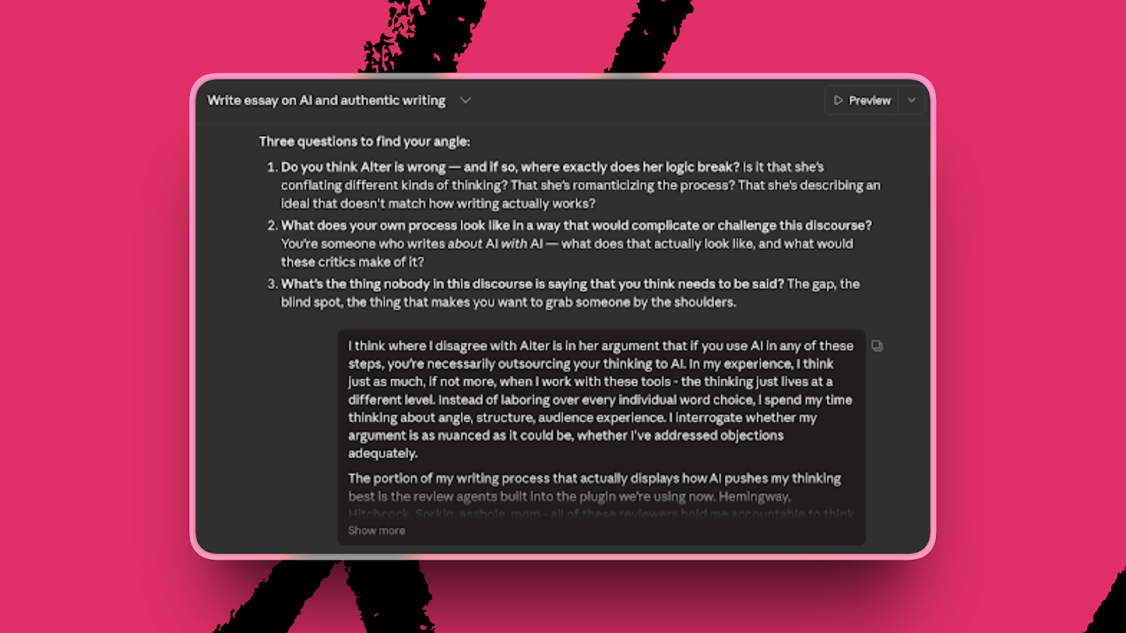 When I sit down to write a piece, and before I even write a word, I have the agent interview me. It asks questions to draw out what I’m thinking about the topic. For example: “Why is this on your mind? How has this shown up in your work? What do you want readers to walk away thinking about?” For this piece, since it was a reaction, it asked me: “What’s the friction for you personally here? When you read these tweets, what makes you want to write about it—is it that you think the critics are wrong? That they’re right but for the wrong reasons? That the whole frame is off?”