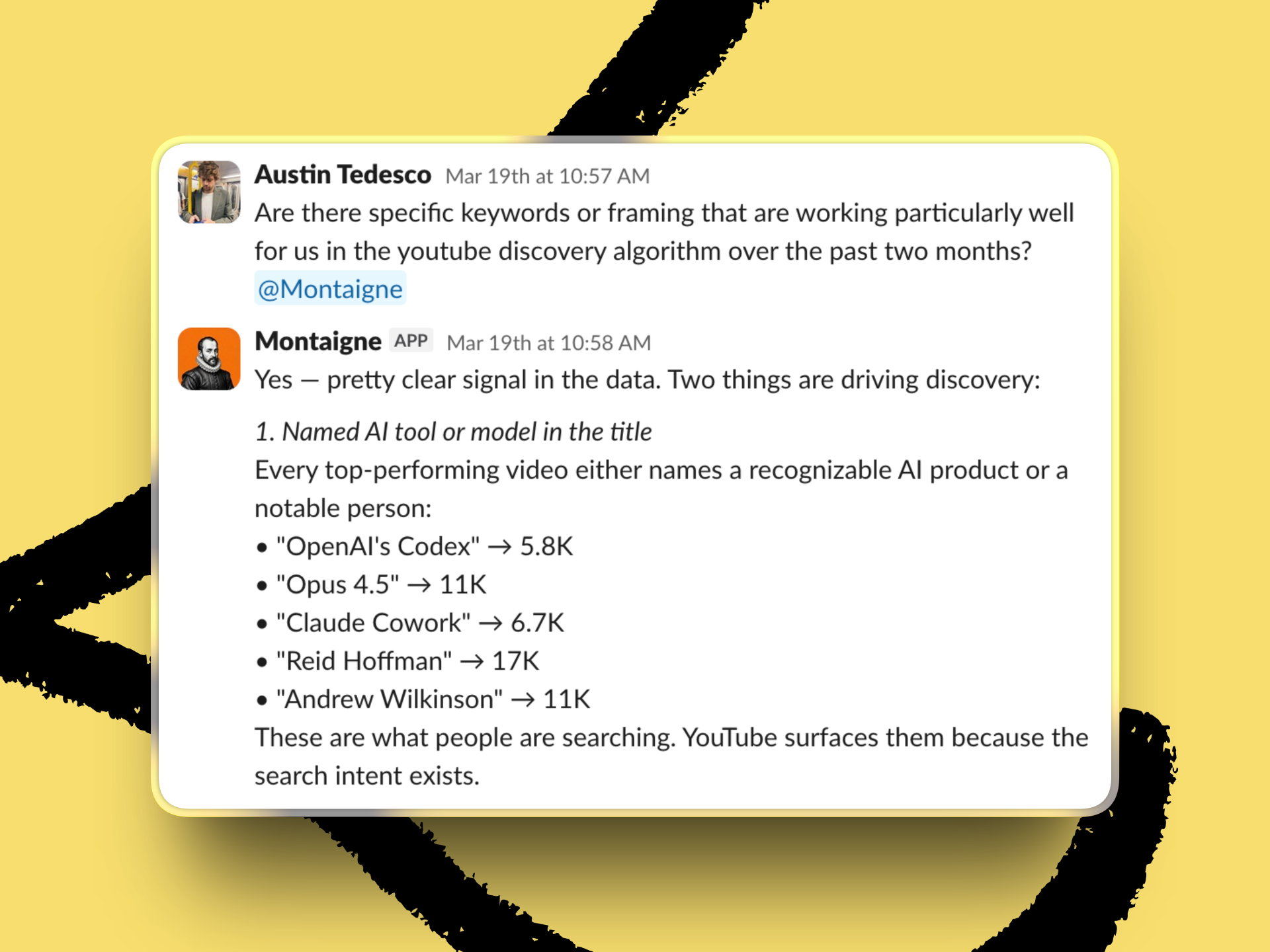 - Agents gain credibility by doing. The fastest way to get other people to trust and use your Plus One is to have it execute tasks in public. Austin Tedesco is Every’s head of growth, and Montaigne, his Plus One, essentially co-runs the department. Austin asks Montaigne to generate campaign scorecards, analyze metrics for growth insights, and handle all sorts of other complex tasks. Watching Montaigne pull off these requests proves its capabilities to the team—and inspires others to push their Plus Ones to achieve more, too.