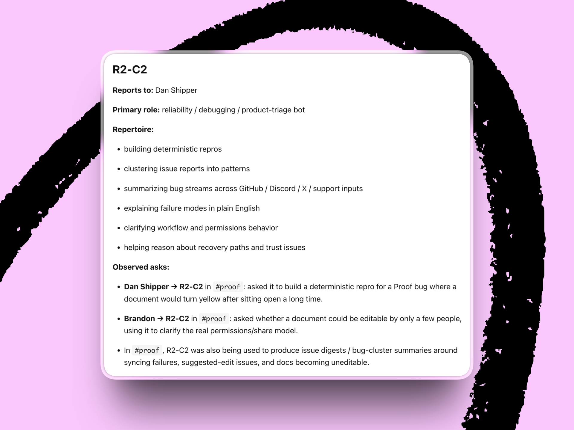 - We’re writing the etiquette in real time. Each person at Every has a dedicated OpenClaw AI assistant, or Plus One, trained to assist with or fully handle parts of our jobs. R2-C2, for example, reports to Dan and is responsible for collecting flagged bugs and generating pull requests for Proof, Every’s collaborative document editor for agents and humans. So when do we turn to Dan versus R2-C2 for Proof-related troubleshooting? Brandon’s rule of thumb: If an established process or tool needs to be used or fixed, ask a Plus One. R2-C2 knows all about Proof, and Dan’s a busy guy—bug reports and questions about how to use the app or report a bug should always go to the agent.