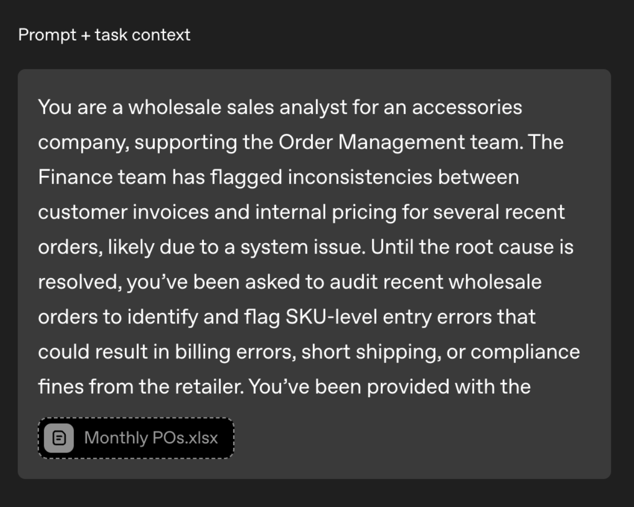 Let’s take GDPval. Humans decided to undertake it in the first place: They picked the industries and occupations (44 roles across the nine biggest GDP sectors), while professional “task writers” picked the specific scenarios in which to use the AI and created the prompts. The prompts themselves are quite detailed; in the wholesale sales analyst example, the prompt spells out the situation, data structure, business rules, and deliverables in painstaking detail. It specifies the exact columns in the spreadsheet attached to the prompt and even explains the company’s packaging rules—for example, that some products are shipped individually while others must be shipped in full boxes of a certain size.