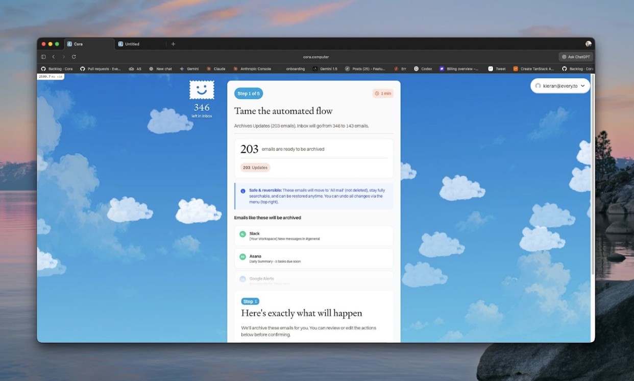 We were preparing for the launch of Cora‘s email bankruptcy feature—a free service that clears users’ inbox for them without deleting anything important. Lucas Crespo and Daniel Rodrigues, Every’s designers, had turned my ugly-but-functional flow into those beautiful Figma designs: something people would want to use, with clean layouts, thoughtful interactions, and the kind of polish that sets software that delights apart from software that works. Now I had to build it.