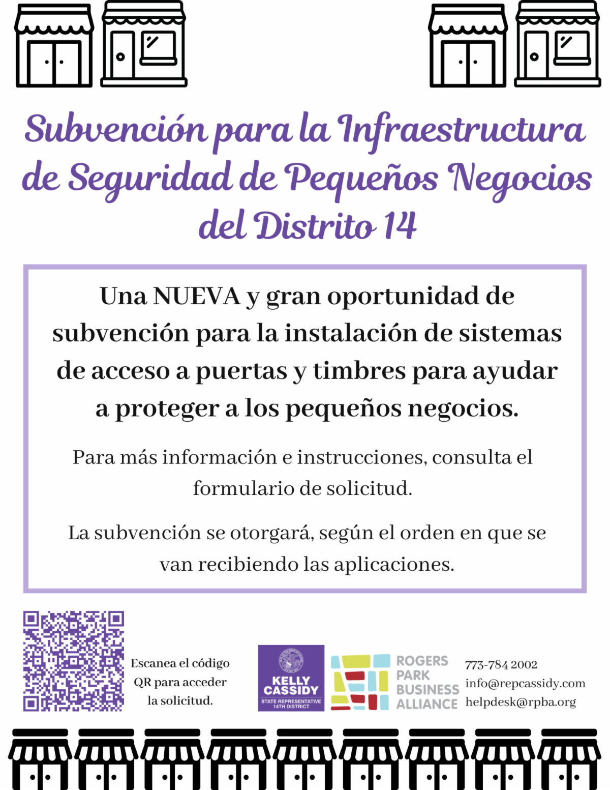 La oficina de la Representante Estatal Kelly Cassidy y la Alianza de Negocios de Rogers Park (RPBA siglas en inglés) ya han entregado más de $320,000 en apoyo a 45 negocios locales a través del Programa de Subvenciones para la Infraestructura de Seguridad de Pequeños Negocios del Distrito 14, financiado por el Departamento de Comercio y Oportunidades Económicas de Illinois. Ahora están ofreciendo una cantidad limitada de sistemas de control de entrada (timbres) para negocios vulnerables con el fin de fortalecer la seguridad en sus espacios de trabajo.