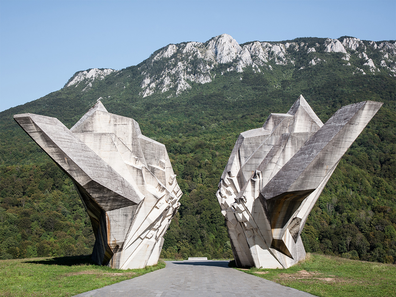 To encounter a spomenik is to experience design’s ability to foster a state of contemplation. Dotted throughout the former Socialist Federal Republic of Yugoslavia, these concrete or steel memorials are often monumental in scale, brutalist in style and symbolically abstract. They resemble relics from a dystopian future or a timewarp that took place exclusively in what is now Bosnia and Herzegovina, Croatia, North Macedonia, Montenegro, Serbia and Slovenia. Spomenici – Serbo-Croatian and Slovene for “monuments” – were built in the aftermath of the Second World War to commemorate unspeakable horrors: a period of occupation by Axis powers, mass killings, the imprisonment of political opponents and a genocide committed against ethnic Serbs, Jews and Roma people.