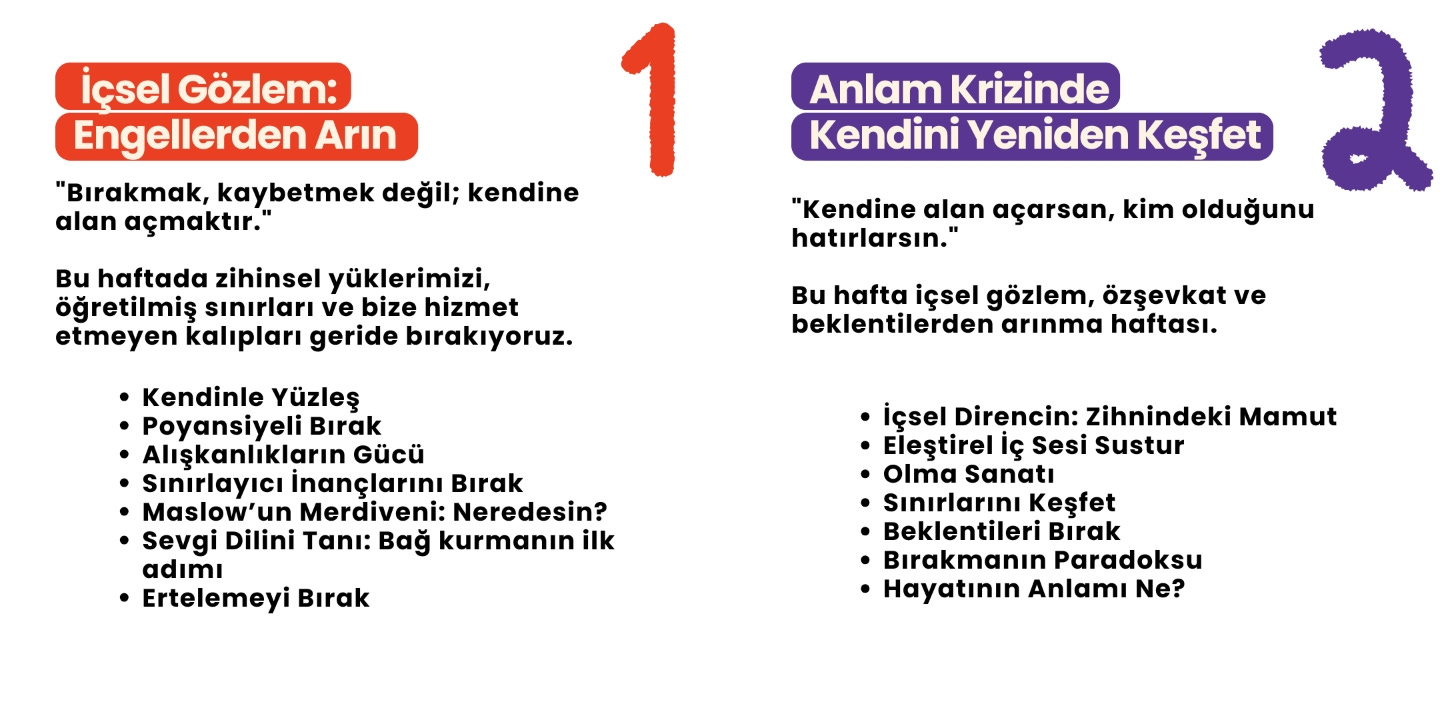 2.Tema: Anlam Krizinde Kendini Yeniden Keşfet"Kendine alan açarsan, kim olduğunu hatırlarsın." Bu hafta içsel gözlem, özşevkat ve beklentilerden arınma haftası.