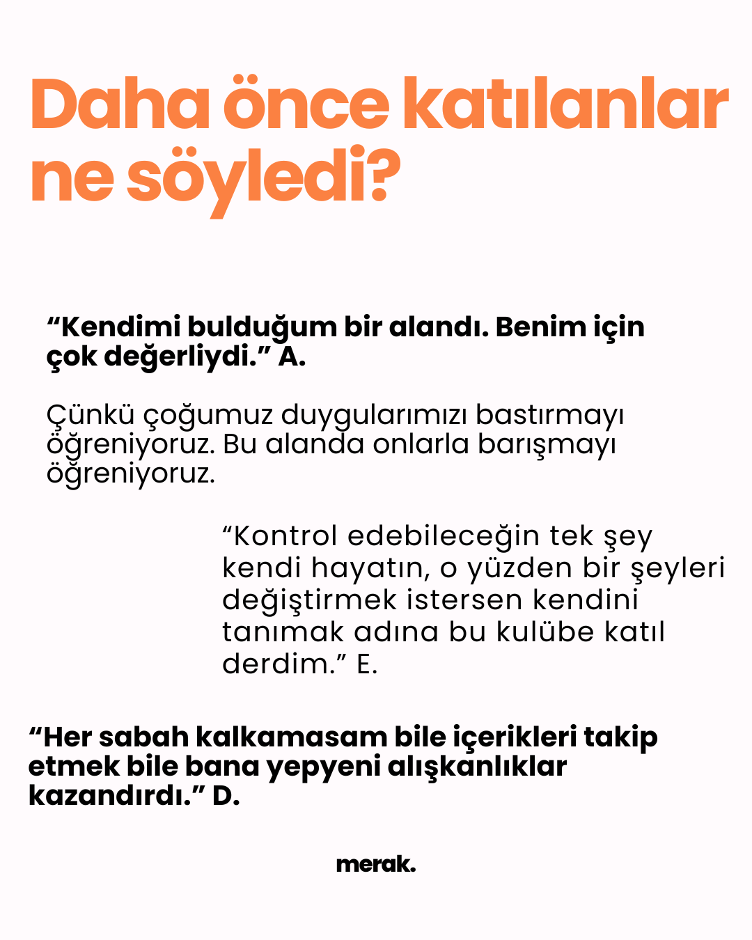 İlk 9 grupta şu ana kadar 132 kişiyle bu yolcuğa çıktık. Seni de bu harika topluluğa bekliyoruz! İNDİRİMİN SON GÜNÜ 27 NisanMeraklı insan, 30 günlük yolculuğu şu an satın almak istersen “merak20” kodu ile %20 indirim fırsatından yararlanarak 2000 lira yerine 1600 liraya satın alabilirsin. Hemen aşağıdaki linke tıkla ve kısıtlı olan indirim fırsatından yararlan. Neler Olacak?30 gün boyunca, kendini bilmenin ve kendini gerçekleştirmenin önündeki içsel ve dışsal engelleri fark etmeni sağlayacağım. Bu engelleri aşabilmek için artık sana hizmet etmeyen alışkanlıklarını, sınırlayıcı inançlarını nasıl bırakacağını, ihtiyacın olan yeni becerileri ve bakış açılarını kazanmanı sağlarken etkili bir rutin oluşturmana destek olacağım. Potansiyelini açığa çıkarmak için bu yolculuğa benimle çıkmaya hazır mısın? Amaç: Kendini tanımak, hayalini kurduğun kişiye ulaşmak için gereken becerileri geliştirmek ve istikrar sağlamak. Her Gün Daha İyi Bir SenHer sabah güne 20-20-20 kuralını baz alarak zihnine, bedenine ve ruhuna iyi gelecek bir rutin ile güne başlayacağız. Sabah 5’te günün konusuna dair 7-10 dakikalık videosunu alacaksın. Bu videolar ve günün soruları kendine dair farkındalık, yaratıcılık, hayal, merak, içgörü ve ilham uyandırmak için 6 yılın üzerindeki içerik üreticiliği ve kendini tanıma sürecimdeki deneyimlerle hazırlandı. Hayır Sabah 5’te kalkmana gerek yokVideoları önceden kaydedip, her sabah günün teması ile paylaşacağım. Böylece onları kendi hızında izleyebilirsin. Benimle birlikte sabah 5’te kalkmana gerek yok ancak kalkarsan kendine yeni bir rutin oluşturman daha etkili sonuç almanı sağlayabilir.. Whatsapp grubundan birbirimizi takip edeceğiz ve birlikte etkili bir rutin oluşturacağız. 1 Aralık sabahı ve 1 ay boyunca birlikte hareket edeceğiz. Daha önce katılanlar ne demişti?İNDİRİMİN SON GÜNÜMeraklı insan, 30 günlük yolculuğu şu an satın almak istersen “merak20” kodu ile %20 indirim fırsatından yararlanarak 1750 lira yerine 1400 liraya satın alabilirsin. Hemen aşağıdaki linke tıkla ve kısıtlı olan indirim fırsatından yararlan. 30 Günlük bu yolculuğu 4 tema üzerinden planladım. Kendini bil, kendini yeniden keşfet, potansiyelini açığa çıkar ve İlişkilerini iyileştir. Aşağıda 1.günden son güne kadar hangi konulara eğileceğimizi görebilirsin. Her gün konuya dair 4-8 dakikalık videolar ile güne başlayacağız. ![]() 1.Tema: İçsel Gözlem: Engellerden Arın"Bırakmak, kaybetmek değil; kendine alan açmaktır." Bu haftada zihinsel yüklerimizi, öğretilmiş sınırları ve bize hizmet etmeyen kalıpları geride bırakıyoruz.