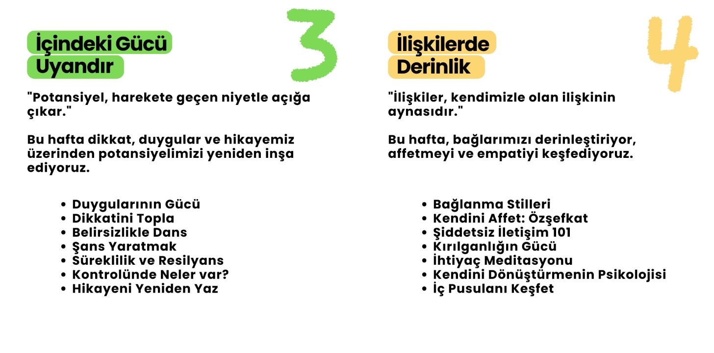 ![]() 3. Tema: İçindeki Gücü Uyandır"Potansiyel, harekete geçen niyetle açığa çıkar." Bu hafta dikkat, duygular ve hikayemiz üzerinden potansiyelimizi yeniden inşa ediyoruz.