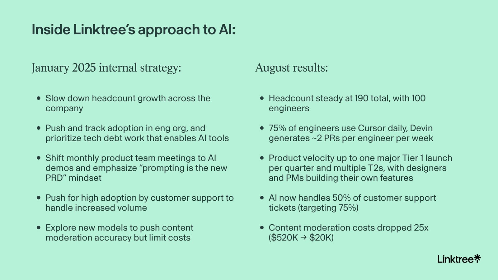 This week, we’re digging into how this 190-person company kept headcount steady while increasing velocity and cutting costs. Going into annual planning for 2025, Linktree’s executive team faced a choice. The company had evolved from a simple link-in-bio tool into a platform supporting 70 million creators and businesses, building a two-sided marketplace, enabling affiliate commerce, and launching influencer campaign tools. Traditional wisdom pointed to significant headcount growth to keep racing ahead with their ambitious roadmap. But rather than scaling headcount, they made a different bet, opting to stay lean at the sub-200 people mark and push AI adoption, hard. Fast forward to this summer and there are a number of early indicators that this strategy is paying off. Headcount is flat, but launch velocity has picked up, costs are down, and tooling adoption is up (so much so that Devin now sits at the top of their internal PR leaderboard). As you’d expect, there wasn’t any one silver bullet here. “AI is advancing much faster than us humans are willing to change our habits,” says Linktree CTO Farnaz Azmoodeh. “The gap won't close itself — you have to relentlessly push for it. Helping people get over that hump is your number one job asan eng leader right now.” In this week’s Applied Intelligence essay, Azmoodeh and former CPO Jiaona Zhang (who's since joined Laurel) share exactly how they transformed their organization, including: - The specific tasks where Devin excels, and the failure modes to watch out for.