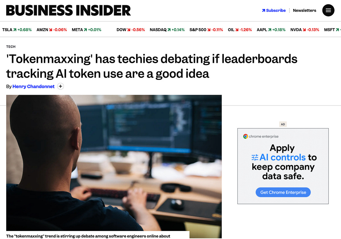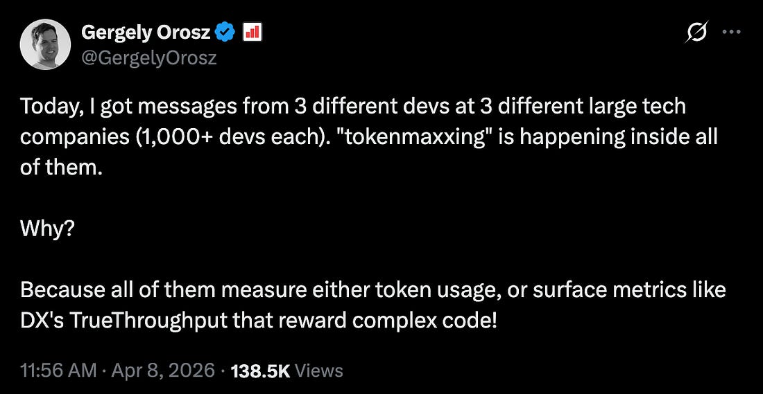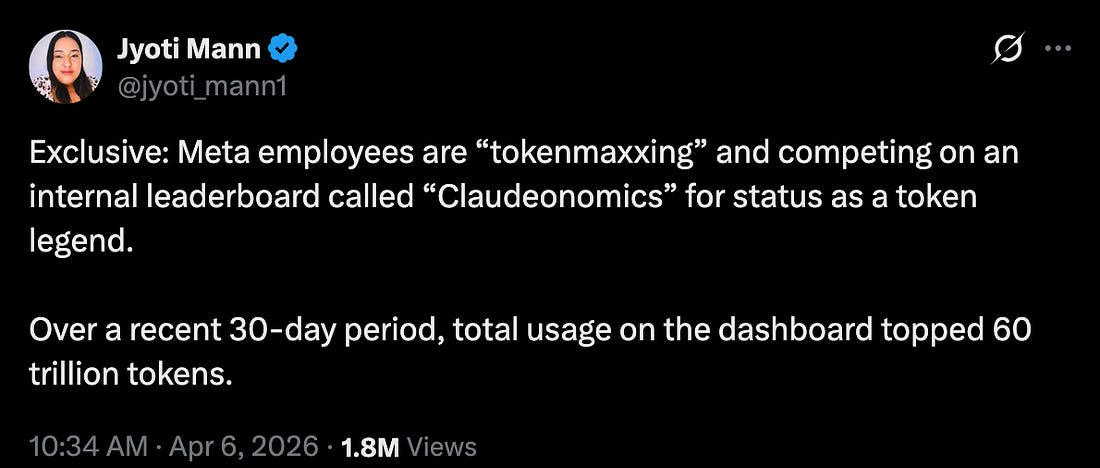 Meta’s tech leadership wants employees to get on board with using AI tools, which makes sense to me. What company wouldn’t want its developers using tools to make them more productive? So to incentivize AI usage, they started measuring token consumption and including it in performance reviews. More tokens = better performance I’ll give you one guess as to what started happening. Employees started competing on who could use the most tokens. If it sounds reasonable to you, take it to the extreme. Some folks are literally just burning tokens for the sake of their numbers, not even for productive purposes. This Meta analyst reports that they’re calling it “tokenmaxxing” and they even have an internal leader board for it: Today’s newsletter is sponsored by my friends at Augment Code. Augment was kind enough to give me early access to Intent, their next-generation tool for developing software. All signs are pointing to the fact that the IDE is no longer the ideal place to create software. Augment Code has jumped on this opportunity, and my first impressions are great. Meta isn’t the only one counting tokens for performanceI like to look at big tech companies like Meta as a nice leading indicator, but they’re not the only one doing this already. If you’ve been reading the newsletter for a while, you’ll already know that other companies are incentivizing and measuring AI usage. Of course, measuring tokens for performance with a “more is better” attitude is out there. Still, it seems others are following suit per Gergely Orosz: Goodhart’s lawIt does surprise me that Meta would go with something this easily gameable. Goodhart’s law says: