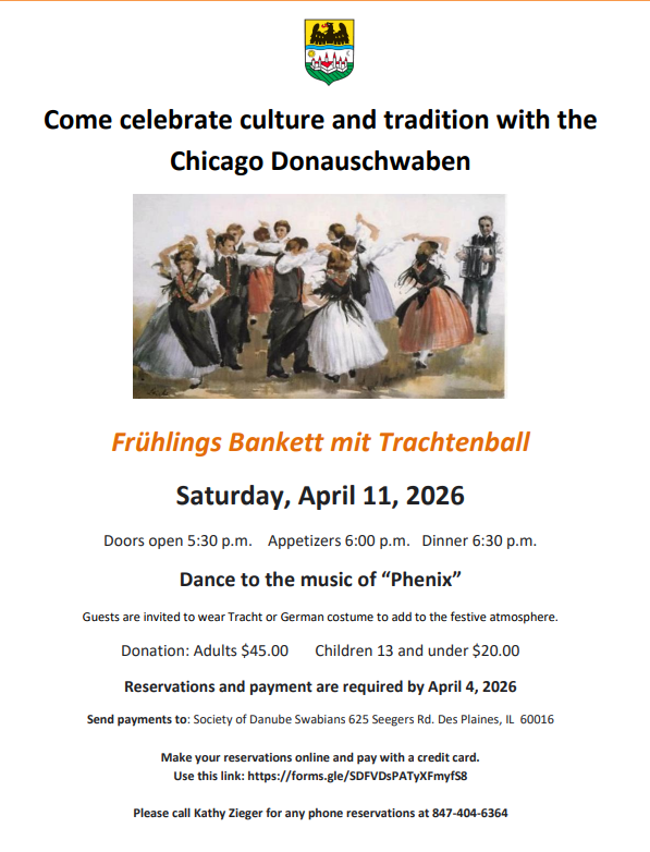Celebrate culture and tradition with the Chicago Donauschwaben! Doors open at 5:30 p.m., with appetizers at 6:00 p.m. and dinner at 6:30 p.m. Enjoy dancing to the music of “Phenix.” Guests are encouraged to wear Tracht or German costume to enhance the festive atmosphere.