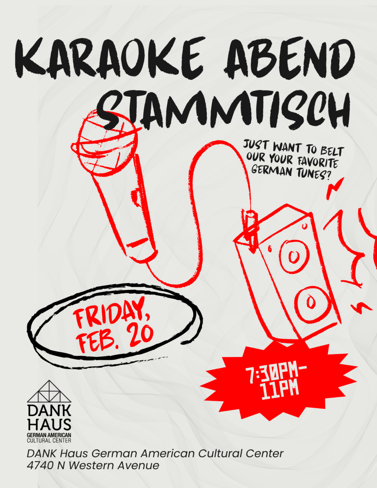 Join us for a lively evening of music and community at our Karaoke Abend Stammtisch! Sing along to German Schlager favorites and classic English hits, or simply cheer on fellow singers. Whether you are a karaoke pro or just looking for a fun night out, everyone is welcome to join in. Food and drinks will be available for purchase.