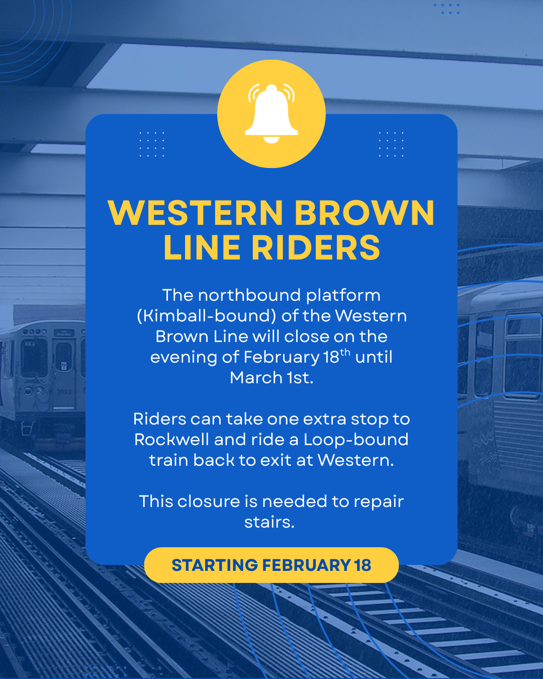 The CTA is closing the north platform (Kimball-bound) of the Western Brown Line station from the night of February 18th to March 1st to repair the stairs. CTA calls this a "ride back" as the CTA recommends that riders take the Kimball-bound Brown Line one extra stop to Rockwell, where they can ride a Loop-bound train back one stop to then exit at Western.