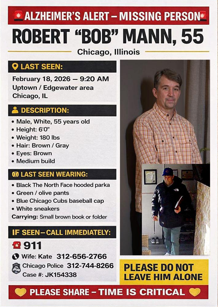 Please note a missing person alert for the Edgewater and Uptown area. Bob Mann was last seen on February 18th at 9:20 AM while wearing a Black North Face hooded parka, green and olive pants, Blue Chicago Cubs baseball cap, white sneakers, and carrying small brown book or folder.