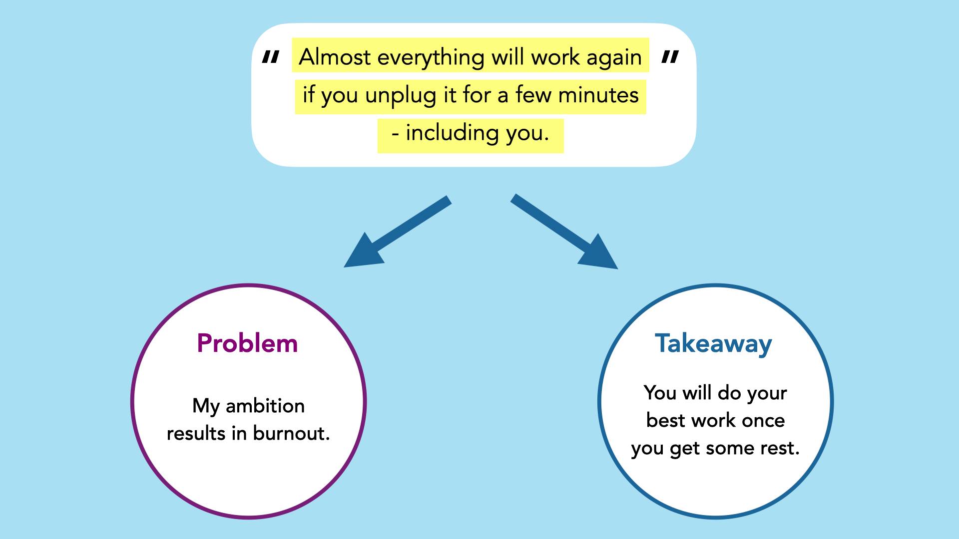 Now that I have the problem and takeaway separated, I can see the beginning of a story start to unfold. Perhaps I’ll introduce an ambitious character that prioritizes getting stuff done, but is always teetering on the edge of burnout. Or I’ll look for a study where researchers tried to understand the link between ambition and burnout, and see if that’s something I can build a narrative around.