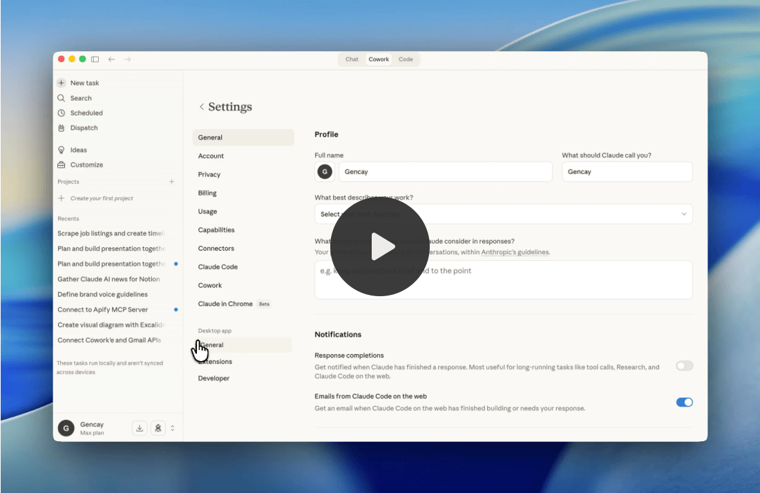 Trigger from Your Phone (Dispatch)Here’s where it gets interesting. Cowork recently launched Dispatch. It’s a persistent conversation between your phone and your desktop. You text Claude from your phone. It runs the task on your computer. 🚨 Tip: Your computer must stay on for Computer Use to work. Everything Cowork can do on your desktop, read files, use connectors, run skills, Dispatch can trigger from your pocket. How to connect your phone with Cowork using dispatch?Steps: Download or update Claude Desktop → Download or update Claude for iOS/Android → Open Cowork → Click “Dispatch” (left panel) → Click “Get started” Click “Get Started,” toggle the permissions on the next screen, and you’re ready. Here’s how I use it: I’ve been working long hours every day, and I can’t predict when a good idea will come. When it does, I want to act on it right away, but I still have daily tasks like walking my dog or going to the market. Before, I used to delay those tasks to focus on the idea. Not anymore. Now I can connect to my computer using Dispatch and control Cowork remotely. With this setup, I can start writing SEO-optimized blog posts as soon as an idea appears. Once Cowork finishes, I simply read the article from Google Drive and review it. Bonus: Computer UseAfter connecting Claude with Dispatch, if you want it to control your computer while you’re away, follow these steps: Steps: Claude Code Desktop App → Go to the bottom-left → Settings → General → Enable “Computer Use” It will need a couple more permissions. After that, you can control your computer using Dispatch & Computer Use. Make It Your Own (Use any Apify actor you want)There are 23K+ Apify actors available now. I showed you Google Search scraping. But the framework works with any data source. Swap the Apify Actor. Keep everything else the same.