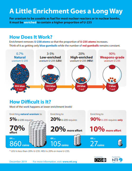 La clave de cualquier programa nuclear está en el isótopo uranio-235, un tipo de átomo extremadamente raro pero capaz de liberar cantidades gigantescas de energía cuando se produce una reacción en cadena. Así el objetivo es enriquecer suficiente uranio-235 para usarlo como combustible nuclear o como material para una bomba. |