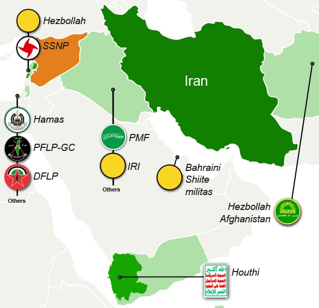 Milicias chiíes de Irak: Tras la invasión estadounidense de 2003 surgieron numerosas milicias chiíes cercanas a Irán. Muchas de ellas se integraron después en las Fuerzas de Movilización Popular (Hashd al-Shaabi), una estructura oficialmente reconocida por el Estado iraquí pero con fuertes vínculos con Teherán. Estas milicias constituyen una pieza clave para garantizar el corredor terrestre que conecta Irán con Siria y Líbano. |