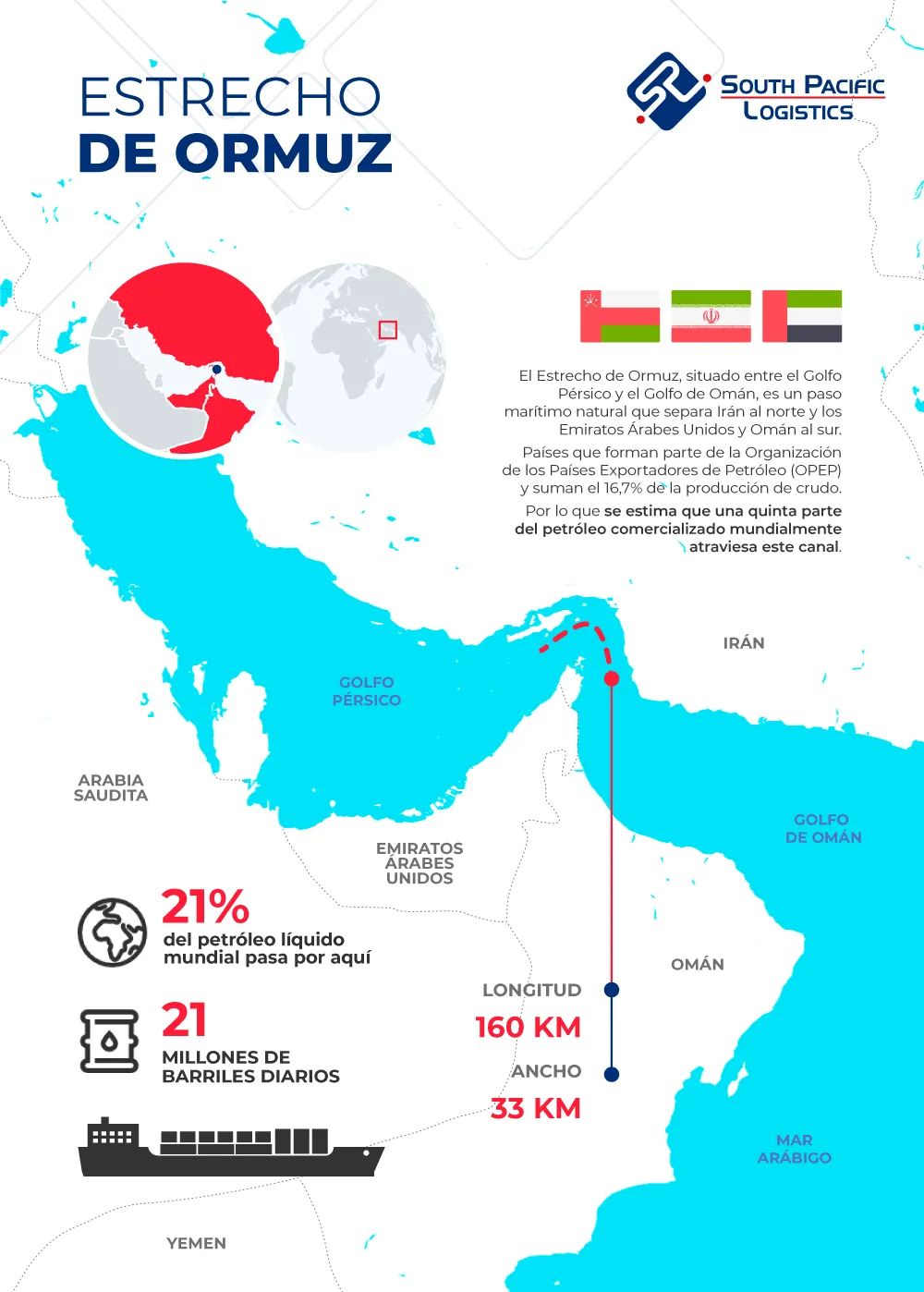 ⛽ Principal arteria del petróleo mundial. Cada día, entre el 20% y el 30% del petróleo que se consume en el planeta atraviesa este estrecho. Decenas de millones de barriles diarios que salen de Arabia Saudí, Irak, Emiratos Árabes Unidos, Kuwait o Irán rumbo a Asia, Europa y otros mercados. Es, con diferencia, el punto de paso de petróleo más importante del mundo. |