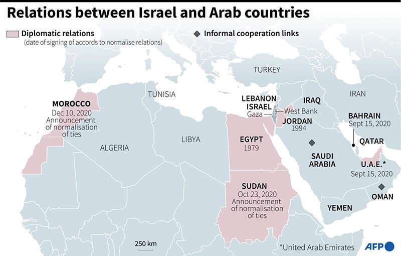 Marruecos: Rabat restableció relaciones diplomáticas con Israel en diciembre de 2020. A cambio, Estados Unidos reconoció la soberanía marroquí sobre el Sáhara Occidental. Ambos son aliados de primer orden de Estados Unidos. La relación también se apoya en la histórica presencia de una importante comunidad judía de origen marroquí en Israel. |