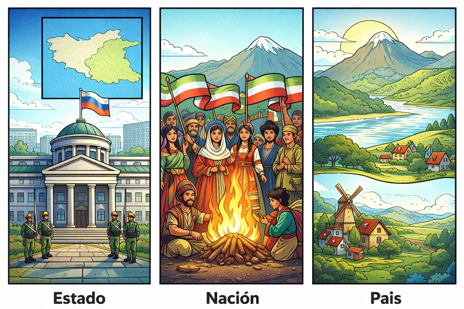 En conclusión: el Estado organiza el poder, la nación define la identidad y el país nombra el territorio de forma más ambigua. Hay naciones sin Estado, Estados con varias naciones y territorios que se consideran países sin ser reconocidos como Estados. |
