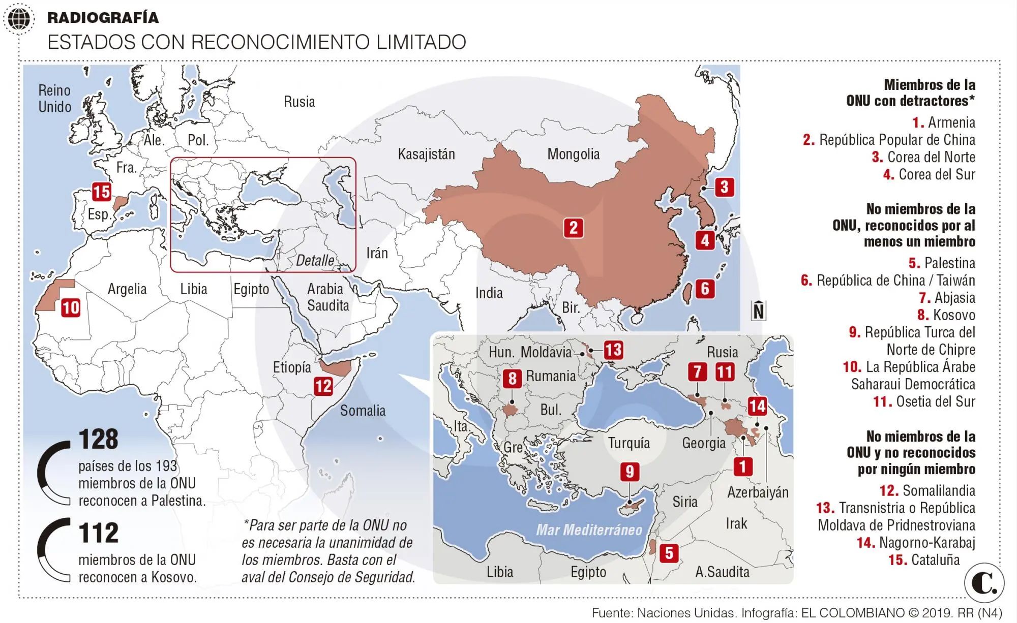 🌍 Estados plenamente reconocidos. Son los países que forman parte del sistema internacional sin discusión. Tienen reconocimiento prácticamente universal y son miembros de la Naciones Unidas. |