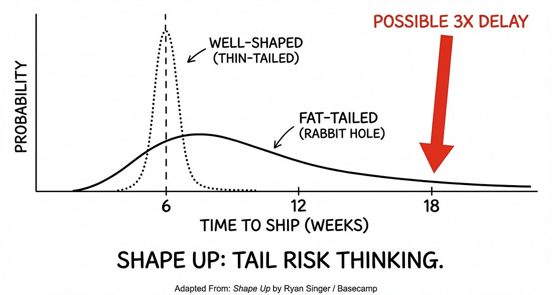 Unlike the Dotted Line, the Solid Line has a Fat Tail—this is where the danger lives. The tail represents all the ways a 6-week build can become a 4-month ordeal. The shape of this curve is determined by the unknowns you haven’t addressed yet.