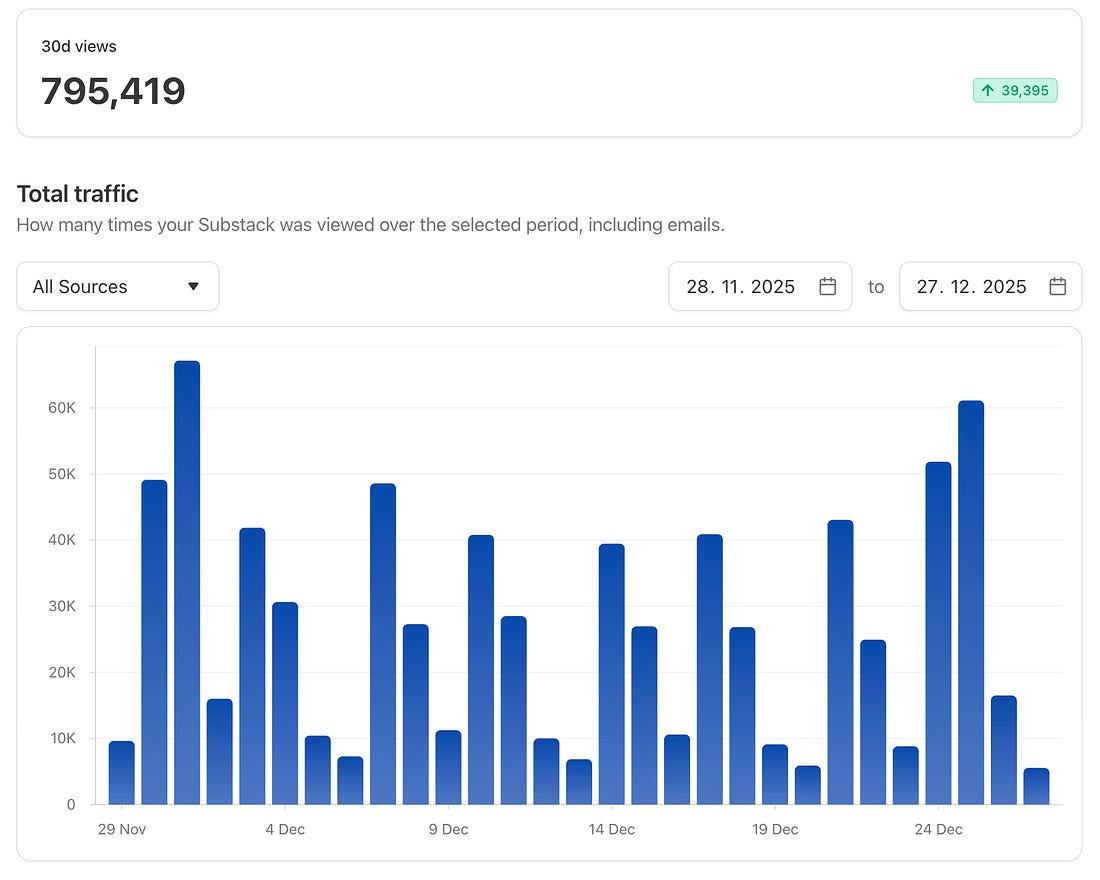 5M+ views in 2025 (up from 3.5M~ views in 2024) → main sources: email, Substack app, LinkedIn, Reddit, Google)
