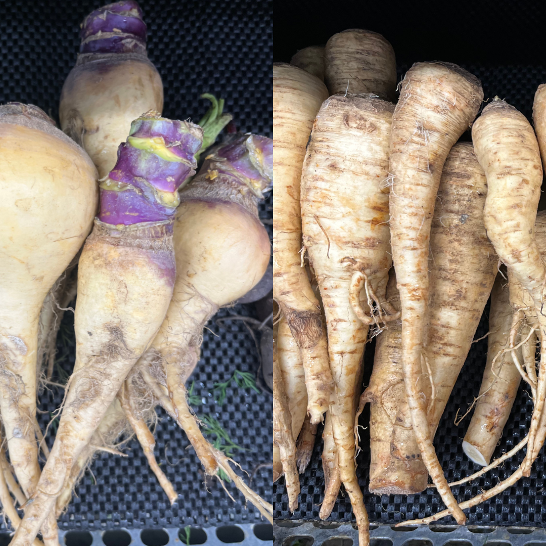 and red kale, rainbow chard, daikon radishes, parsnips, rutabaga, and